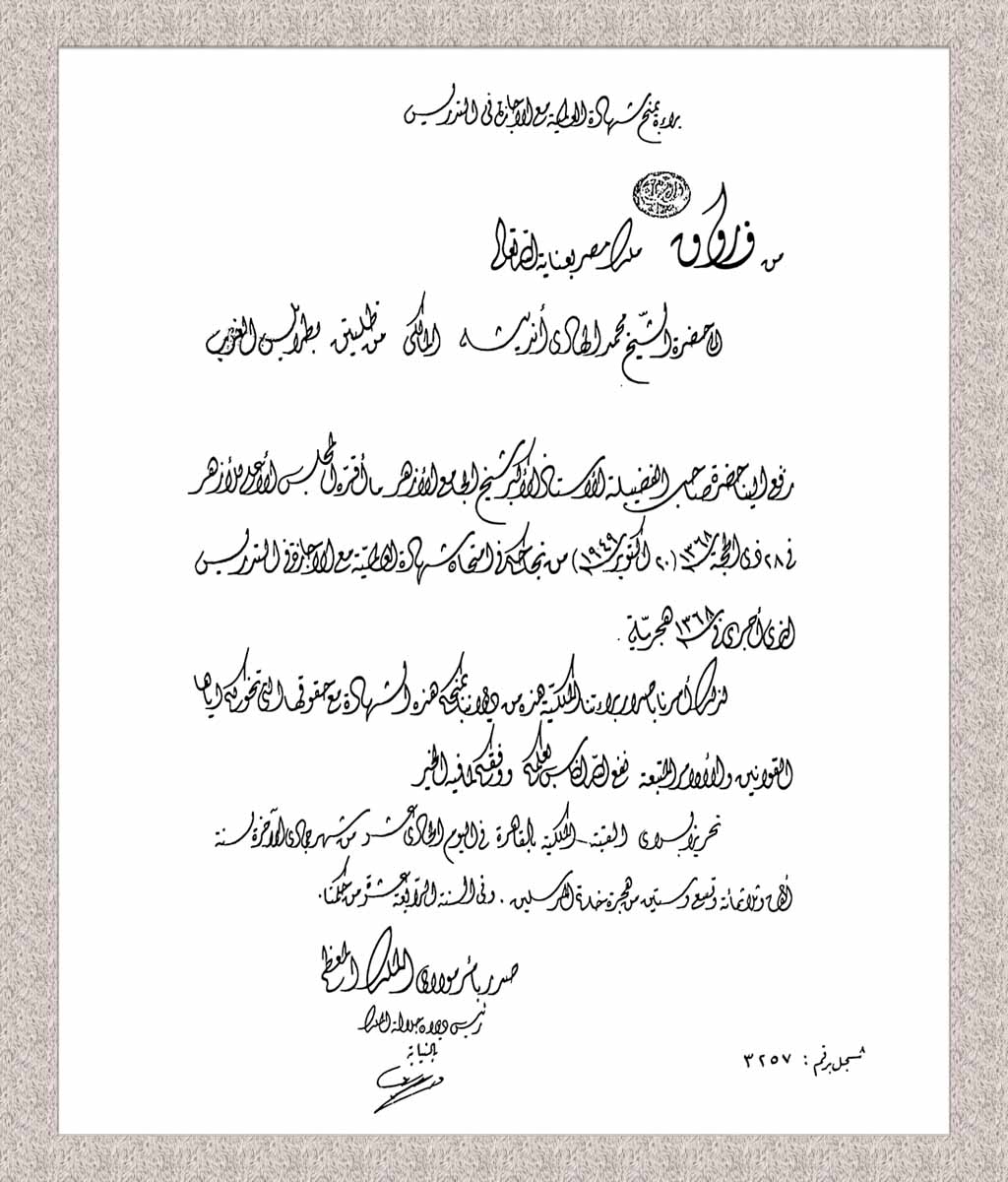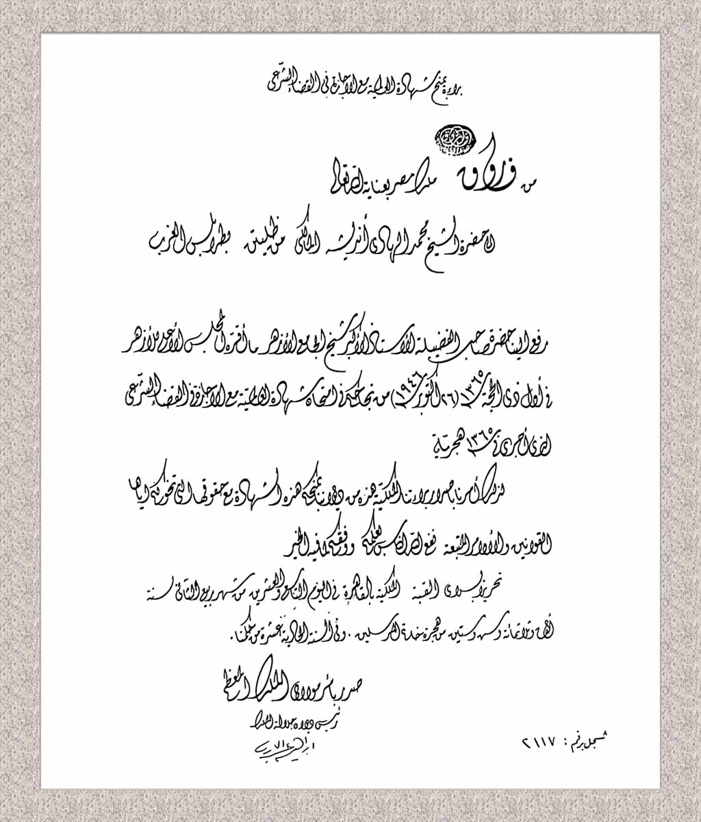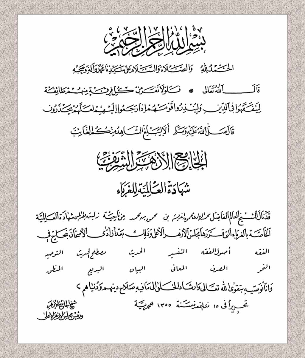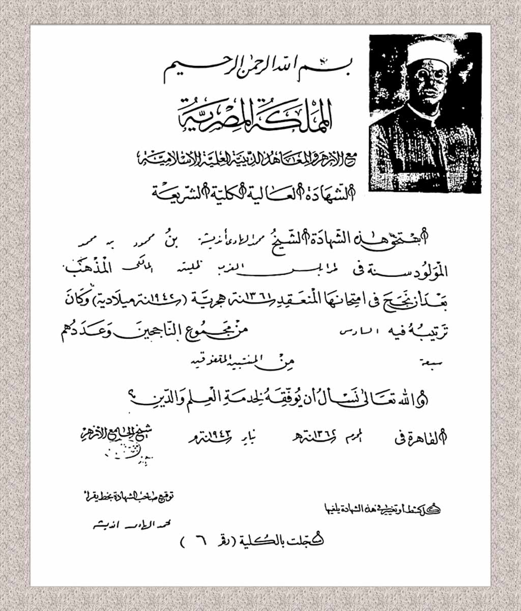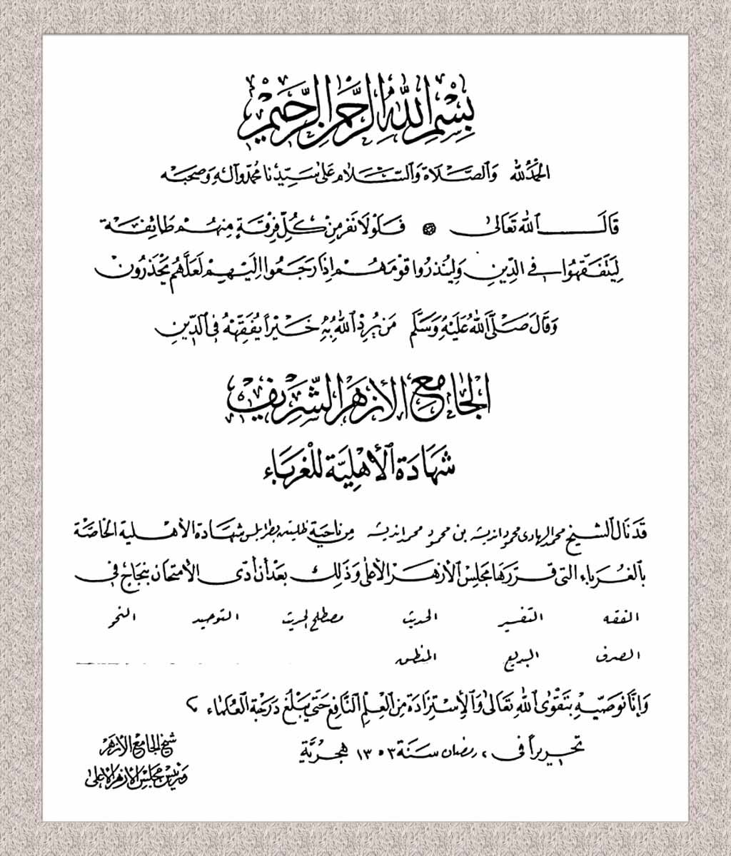 تضمنت هذه الشهادات إجازة الغرباء، وأهلية الغرباء، وعالمية الغرباء، إلى جانب الشهادة العالية لكلية الشريعة، وإجازة القضاء الشرعي، وإجازة التدريس. وقد أهلته الشهادتان الأخيرتان للعمل في مجالات التدريس والقضاء، بالإضافة إلى تقديم الفتاوى الشرعية، مما عزز من مكانته العلمية والمهنية في المجتمع.