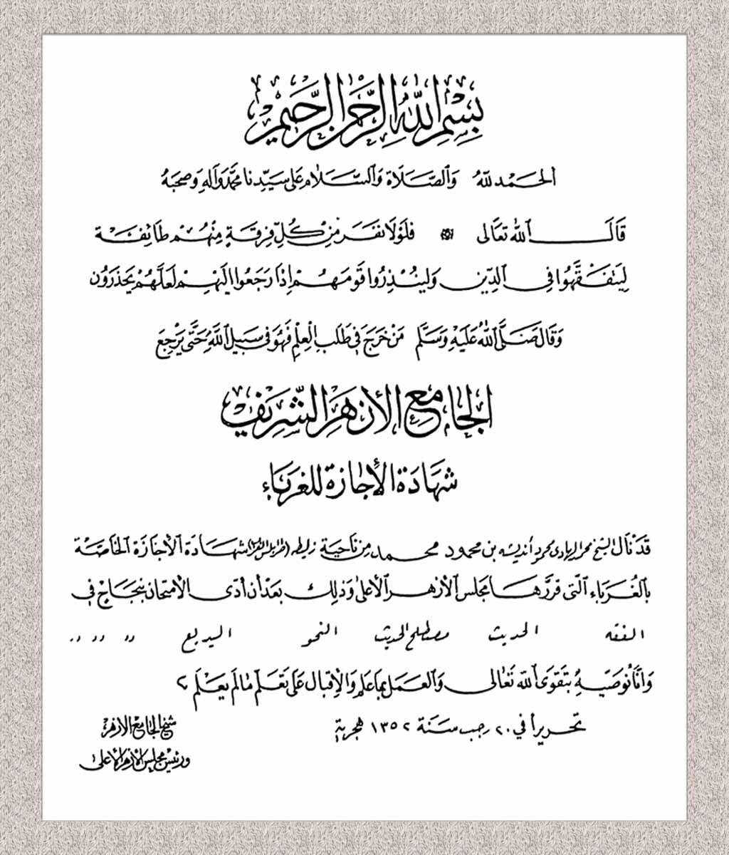 خلال مسيرته العلمية الحافلة، نال الشيخ العديد من الشهادات والإجازات العملية الرفيعة من جامعة الأزهر الشريف، وذلك بين عامي 1933 و1950م.